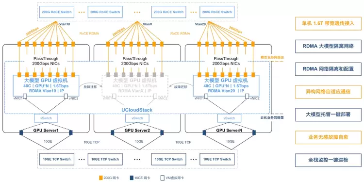 私有化大模型训练场景下,需基础设施提供高带宽和低延迟的网络连接,以支持大规模数据传输和分布式训练。UCloud优刻得大模型一体机基于RDMA RoCE网络模型,构建单计算实例1.6T ETH RDMA网络,为私有化大模型训练和调试提供高性能计算网络,提升GPU利用率,降低通信时延,提高大模型训练效率。