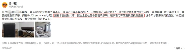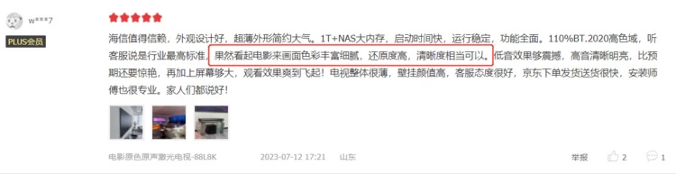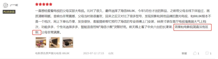 在京东平台,海信激光电视L8K好评度达100%,“优越的观看效果”是用户的热评关键词。