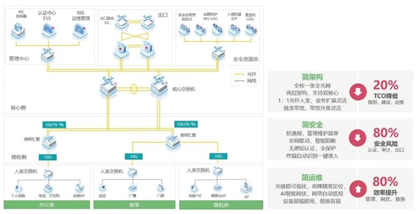 中小学校园网络建设场景具备3个特点:1、教学楼长,房间间距超过100米,弱电间多,加中继造成拓扑复杂;2、教室房间相邻,密集分布,从走廊部署线缆进入房间,造成桥架压力大;3、广播、安防监控、考场监控、校园教学等多业务并行,业务划分难。针对这些特点,锐捷网络一直在探寻更适合中小学校园场景的网络解决方案。2021年,锐捷创新推出了极简以太全光网解决方案,开启了以大全光网新时代。全新光纤入室的部署方式,结合以太网架构和SDN技术为教育行业客户带来了千兆/万兆带宽的高性能、简运维的网络体验。创新不缀,2022年,极简光2.X采用彩光技术焕新升级,2023年年初,极简光3.0方案承袭了2.X方案的以太彩光技术,降低中心机房到各楼栋之间的布线成本,引入创新性的超聚合核心及超聚合核心模块产品,构建了一张高度集成、稳定可靠、灵活适配、简单运维的全光网络。