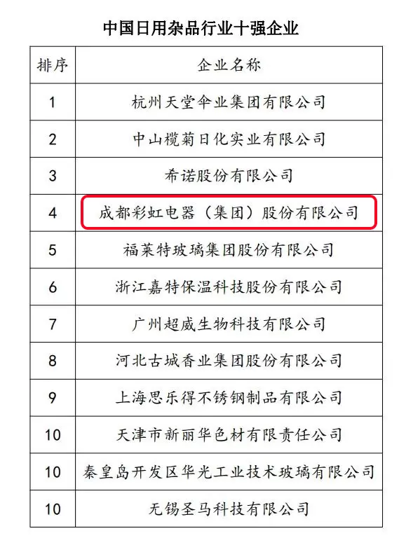 成都彩虹集团入选「中国日用杂品行业十强企业」