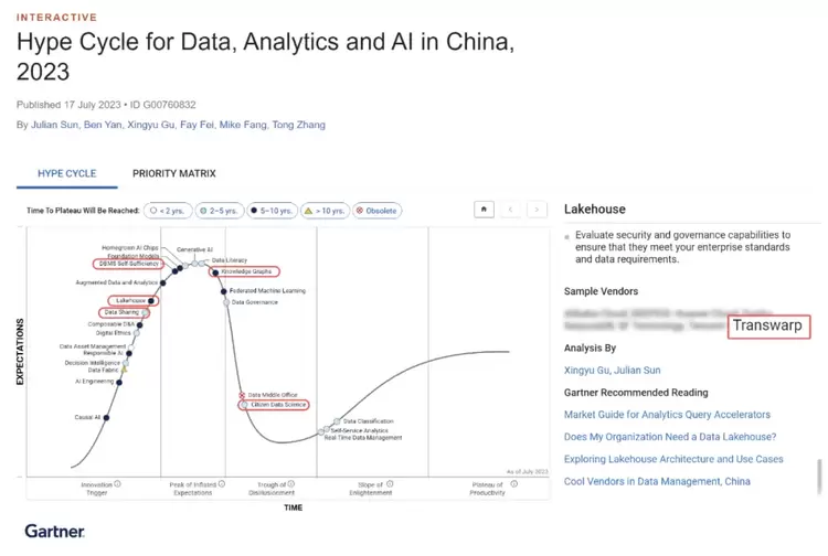 7月17日,Gartner发布了《2023年中国数据、分析及人工智能技术成熟度曲线》(即《Hype Cycle for Data, Analytics and AI in China, 2023》)报告,星环科技能够同时在数据共享、湖仓一体、自主研发、知识图谱和数据科学平民化(即Data Sharing,Lakehouse,DBMS Self-Sufficiency,Knowledge Graphs,Citizen Data Science)5项技术领域入选代表供应商,凭借的是其覆盖数据全生命周期的基础软件产品。