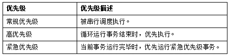一次性事务具有事务优先级功能。OS接受一次性事务调度请求,通过高优先级来处理系统里一些紧急事务,以此达成特定事件的实时处理。