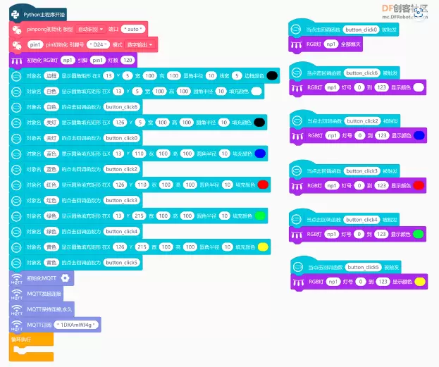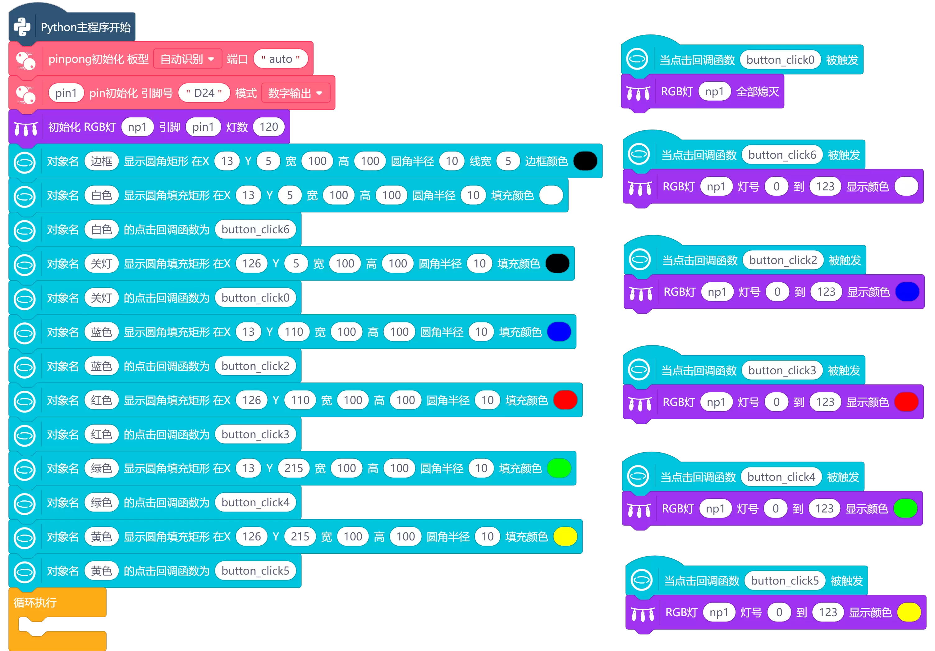 步骤五:行空板结合Mind+图形化编程,使用行空板触屏控制,LED灯亮熄及颜色