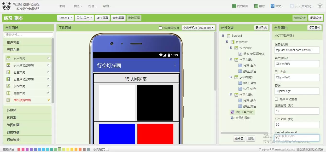 其次,通过Mind+图形化编程,在行空板程序中增加物联网控制功能并对手机APP进行程序设置