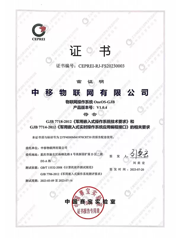 中移物联OneOS-GJB通过军用嵌入式操作系统测评
