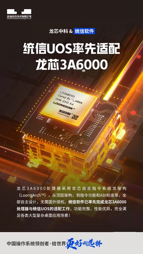 统信软件第一时间完成龙芯3A6000处理器与统信UOS的适配工作,功能完整,性能优异。