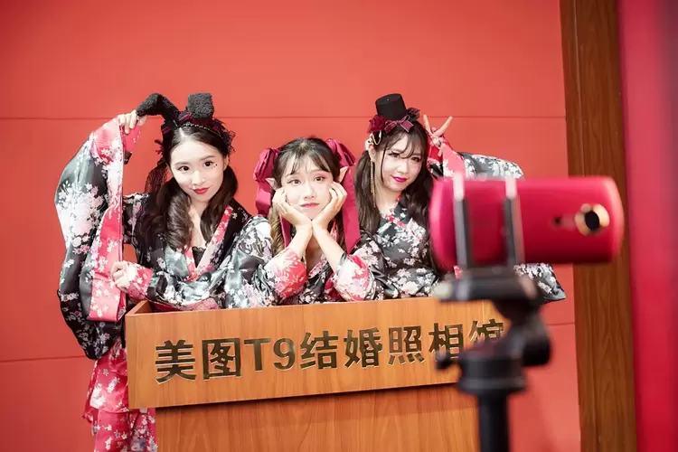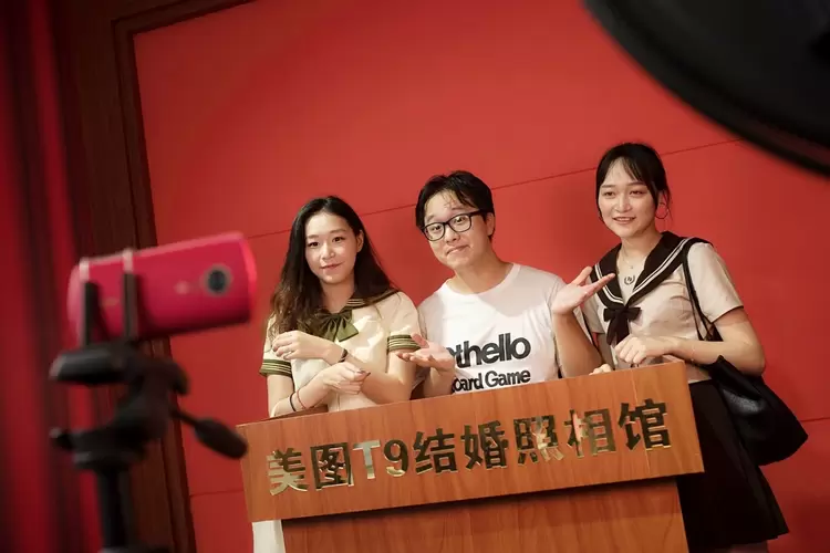 结婚场景现场,还出现了不少年轻情侣成对拍照,用美图T9留下了非常具有纪念意义的一刻。