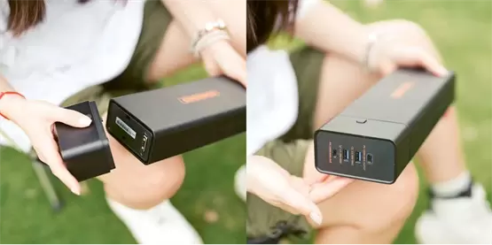 安酷户外电源600采用插拔换电设计,户外可以不断电给设备供电,600W功率同时可插入2块电池,单块电池是324Wh,两块不够就带两块,四块电池就是1296Wh,主机电池仓内的2块电池用完电,再拔出插入另外满电的2块电池,无限个1296Wh电量根本用不完。
