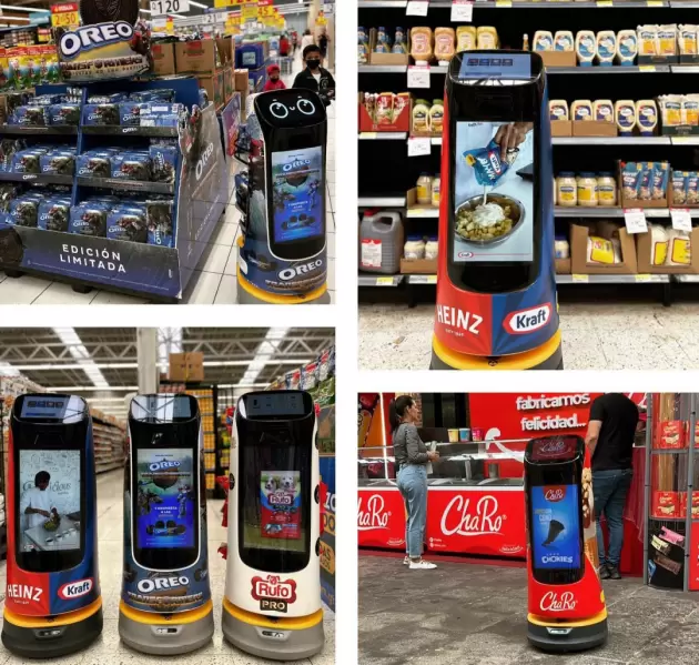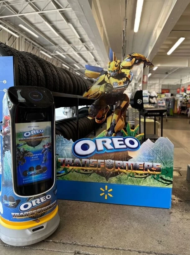 据悉,哥斯达黎加和危地马拉的沃尔玛超市共导入了20个“葫芦”机器人进行商品推销,均匀分布在商场的各个角落,吸引着来往过客的目光。“葫芦”机身中部内嵌18.5吋的超清超广色域智能液晶广告屏,完美地契合了客人的视角,超市通过后台操作宣传素材,向消费者展示奥利奥与变形金刚联名产品,在超市内巡航,并引导顾客到货架前购买。