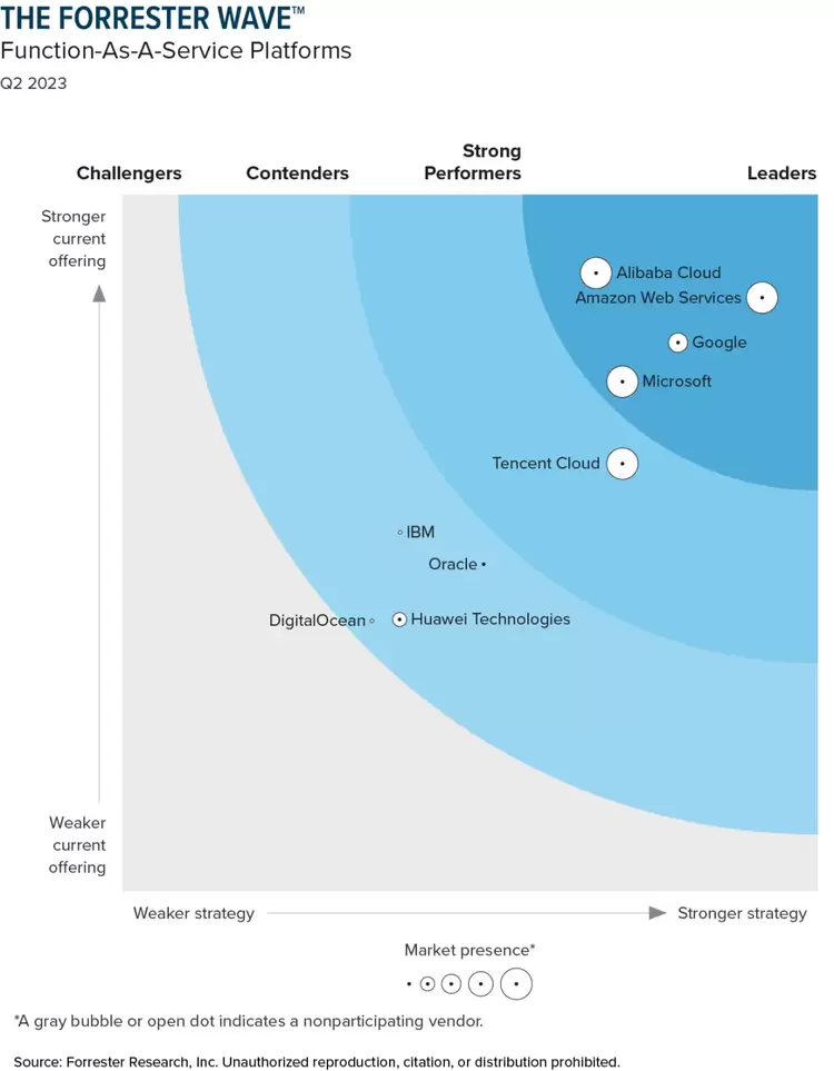 在权威咨询机构 Forrester 发布的最新全球 FaaS 能力报告中,阿里云函数计算凭借产品能力在 40 个严苛的评分项目中拿下 24 个最高分,综合稳居领导者象限,成为国内唯一两度进入该象限的科技公司。函数计算的产品实力加速了与 AIGC 的创新落地。
