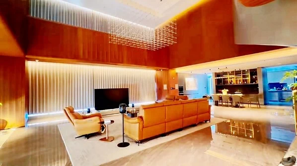 在别墅空间里,布局着A.O.史密斯“新风+空调+地暖+热水”的一整套健康风系统和水系统。开门进入后,客厅会自动开启“回家模式”,灯光亮起、舒缓的音乐传来。通过客厅的智能中控屏,用户可一目了然家中的空气质量,以及空调、新风等家电设备实时运行情况,实现对全屋设备“可视可控”。如果感觉室内空气不好,还可一键“急速净化”/“强力净化”。A.O.史密斯的中央新风机接收指令后立刻启动,给全屋空气增氧净化;如果感觉温度不够舒适,就可以一键选择“制冷/采暖”,双擎混动的技术即刻带来凉而不冷或热浪滚滚的舒适体验,健康又节能。