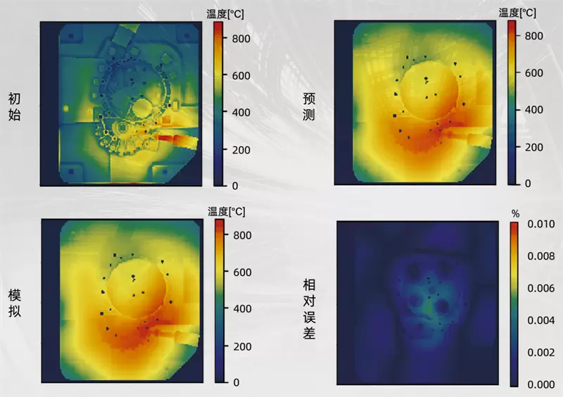 仿真完成后,利用深度学习神经网络训练,即可构建可预测的模具表面三维温度场代理模型。训练后,输入初始温度与工艺参数,即可实现一秒内模具表面温度的快速仿真预测。