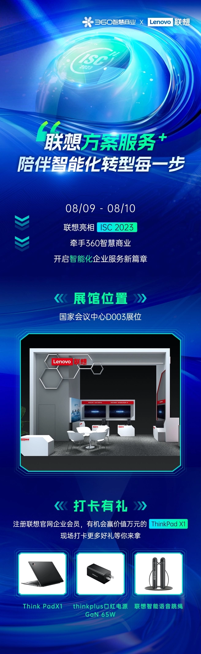 8月9日-10日,联想展厅将亮相国家会议中心D003展位,注册联想官网企业客户(https://mbiz.lenovo.com.cn/activity/isc.html)、线下打卡,还有丰厚福利可以领取,诚邀有合作需求的合作伙伴莅临洽谈!