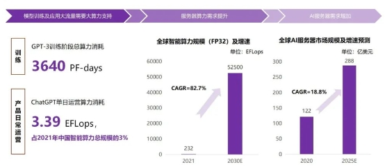 据中国信通院等机构的调研数据,ChatGPT的单日运营算力消耗占整个2021年中国智能算力总规模的3%。而这只是Open AI的一个模型而已,如果中国的百大模型持续蓬勃发展,对国内的智能算力要求将达到惊人的天文数字。
