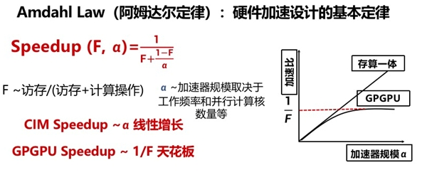 存算一体架构是相对于传统冯·诺伊曼架构下的存算分离而言的。从技术理论的角度来看,要从阿姆达尔定律讲起。阿姆达尔定律是硬件加速设计的基本定律。这个定律包括两个因子,一个是加速器规模α,可以用先进的工艺或者优化设计去提升其工作频率,叠加之后就形成了 “裸算力”;而另一个因子F则是在计算周期里数据访存所占的百分比。