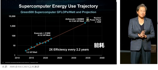 算力需求不断提升带来的挑战除了贵,还有费电。在今年国际集成电路设计领域最高级别会议ISSCC上,AMD全球CEO LisaSu表示,目前实现Exascale(百亿亿次计算)的超级计算机功耗已经到达2100万瓦。而根据Green500的预计,到2035年,实现Zettascale(十万亿亿次计算)级别的一台超级计算机的功率会达到500 MW,相当于半个核电站的发电功率,到那时,世界再多的核电站也难以支撑如此大电力的消耗。而2035年离我们也并不遥远。