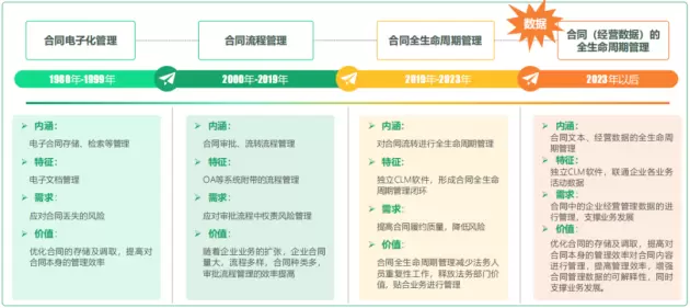 而聚焦国产CLM,从1980年开始,经历了“合同电子化管理”“合同流程管理”以及“合同全生命周期管理”三大阶段后,如今终于走到了“合同(经营数据)的全生命周期管理”阶段,迎来了全新的发展周期,正式进入CLM2.0时代。