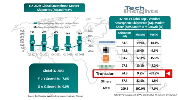 TechInsights:2023年Q2,传音首次跻身全球智能手机厂商Top 5