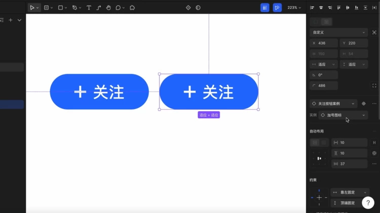 首先,“显示状态属性”可以自定义某个图层的显示或隐藏。我们用一个【关注】按钮组件举例,选中图标后,点击右侧图层版块中的「关联组件属性」按钮,就会出现一个弹窗。我们在属性名称中写上【显示图标】,就完成了对这个属性的描述,默认值就是定义默认的属性选择。点击创建属性后,我们会发现,右侧多出来组件属性的版块。然后拷贝出实例,右侧的实例版块就会多出一个默认关闭的开关,这时我们在最外层就可以随时切换图标的显示和隐藏。