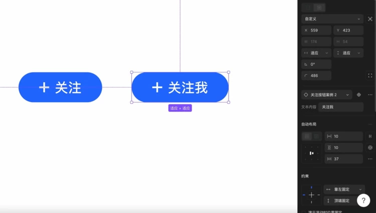 “文本内容属性”可以用来自定义文本图层的内容,具体添加步骤和“显示状态属性”一样。我们先选中按钮组件中的文本图层,然后在右侧文本内容版块中,点击「关联组件属性」按钮。创建属性后,我们拷贝出实例,就可以在右侧版块的输入框中任意修改文本了。