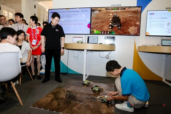 在STEAM展区,一群为机器人编程的小朋友吸引众多参观者驻足。这里展示了基于OpenHarmony打造的STEAM编程平台。该平台为孩子提供了更易上手,更有趣的沉浸式编程体验。不仅培养了孩子的学习兴趣,同样是对传统K12教育的补充。余承东与北京师范大学教育学部教授 李艳燕对鸿蒙生态的发展进行了探讨,并强调OpenHarmony生态正在持续高速的发展,OpenHarmony将携千行百业,为更多行业赋能。