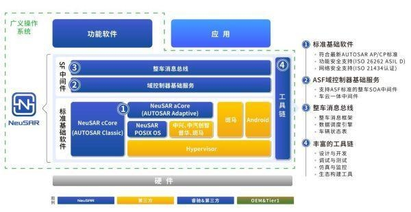 在基础软件层,NeuSAR 4.0支持并满足AUTOSAR 21-11全新版本的模块特性,并对上层提供统一封装的硬件能力和标准服务组件,包括各类协议栈、调度、存储、安全等基础服务组件及接口。