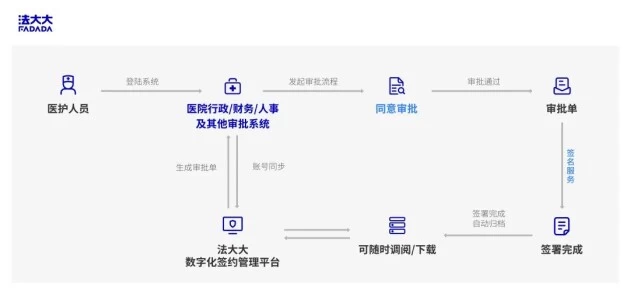 除了患者诊疗过程中涉及的文件外,医院作为一个行政机构,本身也会涉及大量的行政财务文件,在以往的场景中,医生需要先审批,再进行签字和盖章;但现在通过将法大大新一代数智化签约管理平台集成在医院的行政/财务/人事及企业审批系统中,医生在完成审批的同时自动完成电子签名,签名后的审批单和签名信息实时返回办公系统,便于查阅。