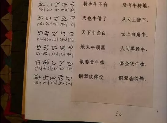 当前非母语研究者在翻译古彝文时,通常需要在母语者的帮助下记音,再用汉语逐字直译,最后采用汉语对整句话进行意译。由于古彝文尚未取得预留的Unicode编码区段,数字化工程还处于起步阶段,所以在印刷出版时,需由一位彝文缮写员先将彝文字和国际编码抄写在书页的左侧,再将已输入电脑的汉文译文打印、剪切后粘贴在相应彝文字的右侧,形成目前常见的“四行体”彝汉文对译,过程十分繁琐。