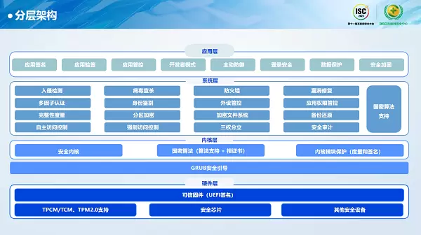 在硬件层结合外接芯片提供硬件可信根,在内核层提供国密算法、模块签名、内核模块保护、外设保护等安全防护接口和能力,在系统层提供身份鉴别、自主访问控制、强制访问控制等安全策略,形成多维度的安全防护手段。统信软件率先发起的USKI,也得到了所有安全厂商的一致认可和支持。