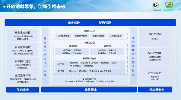 围绕自身安全、生态安全、供应链安全等三大维度,张磊介绍了统信UOS安全链条端到端的“组合拳”: