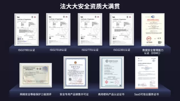 值得一提的还有,经过多年的安全合规体系建设,法大大已经取得了多项权威的安全资质及认证,包括由中国信通院颁发的数据安全管理能力认证(DSMC)证书、由BSI英标协会颁发的四个ISO国际管理体系认证,覆盖信息安全、隐私保护、业务连续性等领域。同时法大大签约平台也通过了网络安全等级保护三级测评,并获得了公安部颁发的安全专用产品销售许可证、国家密码管理局颁发的商用密码产品认证证书,以及工信部颁发的企业级SaaS服务“可信云”认证。
