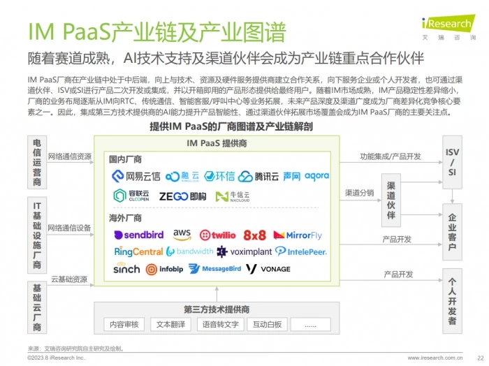 《白皮书》对 IM PaaS 产业链进行了调研分析。IM PaaS 厂商在产业链中处于中后端,向上与技术、资源及硬件服务提供商建立合作关系,向下服务企业或个人开发者,也可通过渠道伙伴、ISV 或 SI 进行产品二次开发或集成,并以开箱即用的产品形态提供给最终用户。