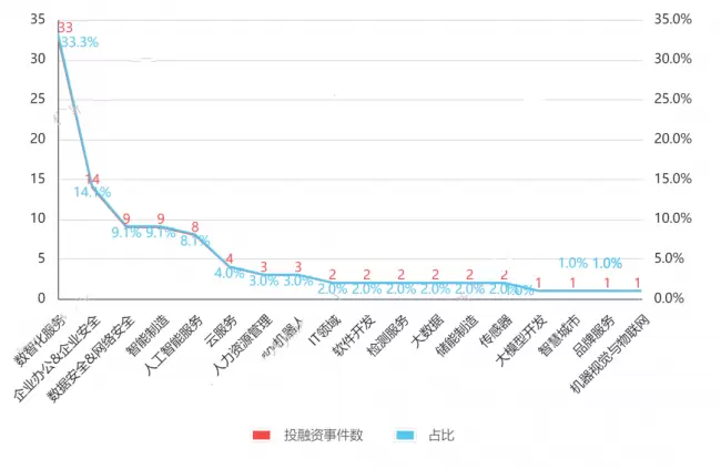 依据IT桔子、烯牛数据的调研:7月份,企服领域投融资事件增至99件,与6月份相比增加了26起;7月份,投融资事件披露金额达133.31亿人民币,与6月份相比增加35%。而按照细分领域来看,7月份99件投融资事件,数智化服务仍排在首位,同6月份的情况一致,企服各细分领域融资情况向好。