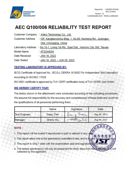 AEC-Q100认证是汽车电子委员会(Automotive Electronics Council)制定的车用电子元件可靠性测试标准,在全球汽车产业都具有极高的权威性。AEC-Q100认证门槛高,测试项目覆盖广,对芯片产品的设计质量、安全性、可靠性要求极为严苛,是集成电路厂家进入汽车领域的重要通行证。AT32A403A通过AEC-Q100认证,标志着雅特力车规级MCU性能与可靠性等指标符合国际车规芯片标准,产品质量获得国际权威认证体系的认可和肯定。