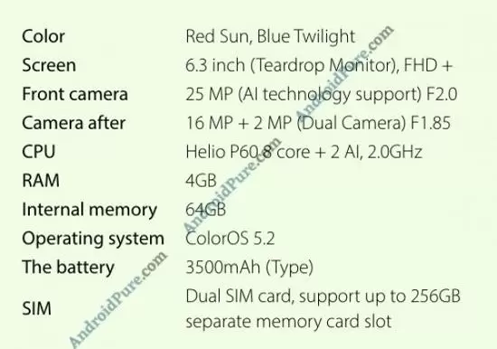 据悉,OPPO F9采用了6.3英寸FHD+显示屏,搭载联发科Helio P60处理器,配备4GB内存+64GB存储,前置2500万像素,后置1600万+2000万像素双摄,光圈为F/1.85,电池容量为3500mAh,运行ColorOS 5.2系统。