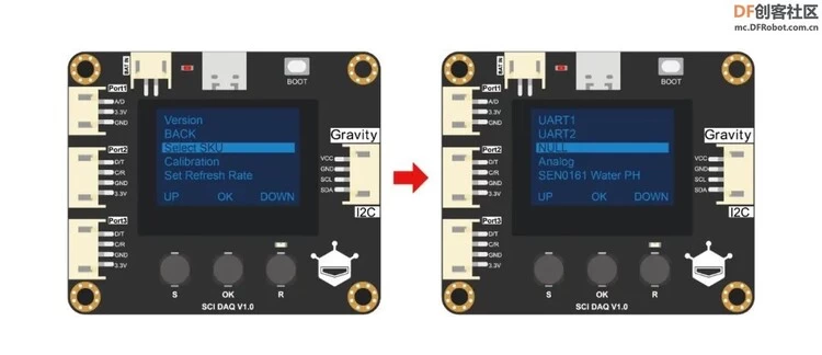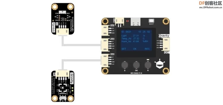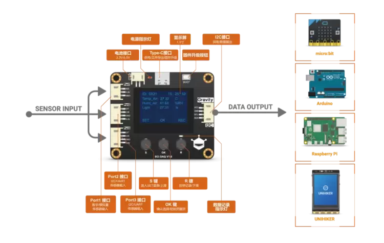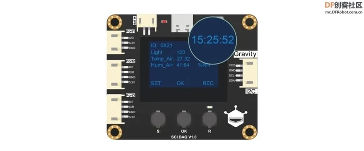DFRobot Gravity: SCI采集模块是一款功能强大且高度集成的数据采集模块,具有屏幕显示、传感器自动识别、传感器校准、数据存储、RTC时钟以及数据转换等多功能,让数据采集变得更加便捷和高效。此外,SCI采集模块支持多种供电方式,可通过I2C接口输出传感器采集的物理量数据,兼容Arduino、micro:bit、掌控板、行空板、树莓派等硬件平台。