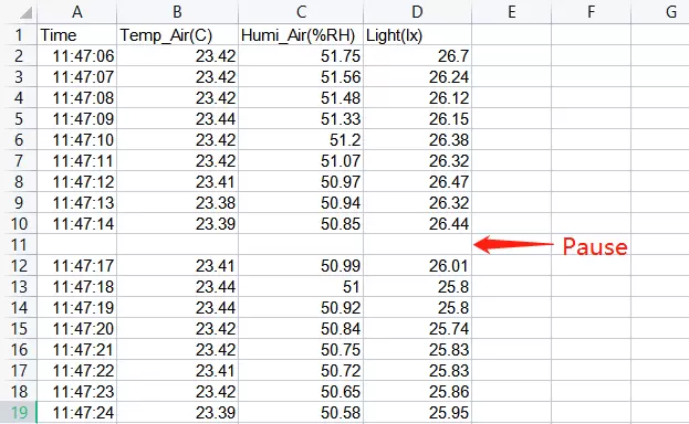 所有数据都将存储在同一个CSV文件中,每次数据记录暂停或开始后都会有一个空行作为标记。
