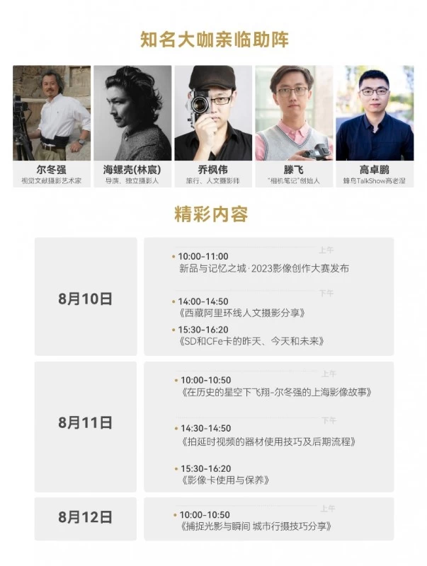 在3天展期内,Lexar雷克沙计划组织6场与摄影及存储相关的讲座,邀请视觉文献摄影艺术家、导演、独立摄影人、摄影课堂首席讲师、专业摄影研究学者等,就摄影实践和摄影思考进行深入地挖掘和讨论,影像无处不在,存储无处不在。