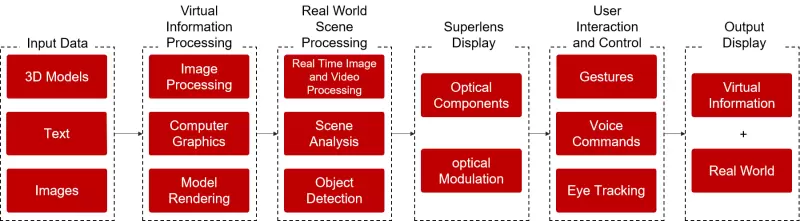 全息增强现实(AR)是一种将计算机生成的虚拟信息集成到现实世界中的技术,被视为下一代显示技术。目前为了实现更好AR展示,已经开发了各种技术来减少虚拟信息与现实世界场景之间的差异感,为用户提供身临其境的体验。目前各种目镜,例如基于球面镜,自由曲面光学元件,衍射光学元件(DOE)和全息光学元件(HOE)的目镜等。它们都是基于其自身的光学特性实现的透明近眼显示器的概念,但由于传统光学器件的局限性,实现AR眼镜的高可用性和真正的移动性仍然存在一些挑战。特别是,为了实现终极AR眼镜,有必要提供超宽视野(FOV),紧凑的外形以及足够的便捷的轻量设计,可以在瞳孔中观察到完整的图像。基于此,微美全息(NASDAQ:WIMI)设计开发了一种用于增强现实的超表面目镜是,它是基于人工制造的亚波长结构组成的超表面技术。超透镜采用了特殊的光学设计和工程各向异性光学响应,以实现超宽视场、全彩色成像、高分辨率的近眼显示。