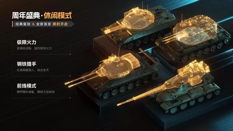 随着周年纪念开启,多种新玩法将陆续降临《坦克世界》。趣味模式——“极限火力”将率先登场,体验奇特的坦克组装方式,8辆改装了自动炮的坦克,将在这一模式中与指挥官们见面。此外“钢铁猎手”模式和带有全新机制的“前线模式”也将在周年活动期间上线。