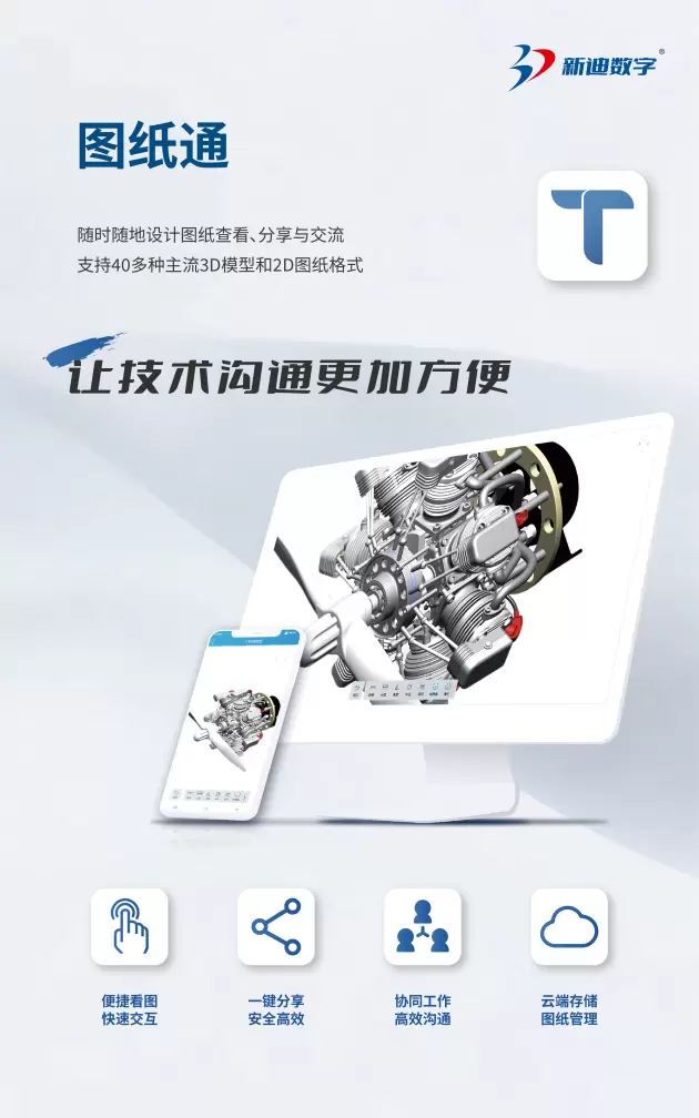图纸通集云端看图、分享图纸、批注图纸、沟通图纸、管理 图纸、项目协作等多功能于一体,支持手机 APP、微信、浏览器、PC 电脑多种应 用终端,支持40多种3D模型和2D图纸格式。可应用到产品研发设计、生产制造、售后服务等多个环节的技术交流工作中。