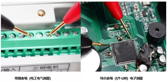 不仅如此,UT15B MAX/UT17B MAX/UT18B MAX数字万用表还十分注重用户体验。考虑到使用场景的需求,该系列产品特意配备两套镀金表笔,常规表笔采用标准镀金笔尖表笔,可用于电工电气测量,常规测试不易变形;1mm特尖镀金表笔可用于电子测量,在电路板上及狭小空间内进行精细测量时更能游刃有余。这样的配置,可以说是非常的惊喜与贴心。