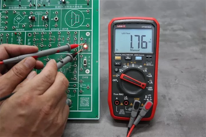 LED智能测量功能(仅UT18B MAX)也是其亮点之一。产品拥有插孔式测量和表笔测量两种测量LED的模式,LED测试端最大输出持续电压12V,最大输出峰值电压30V;LED工作电压小于9V可持续点亮,9V-12V闪烁点亮;如果 LED 短路,被测LED不会发光,两个正极状态指示器将点亮。