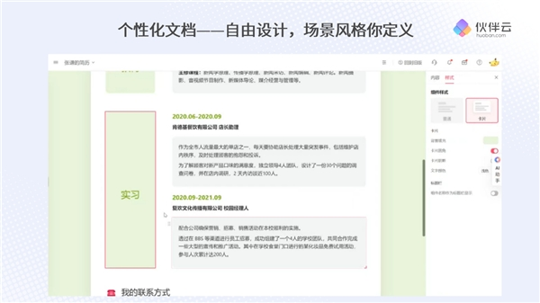 个人笔记、个人简历、产品需求文档...自由设计,场景风格你定义!在文档类页面中,可以将内容挡在大的文本组件中,也可以分块进行。可以设置文字的大小格式,从一级到五级,也可以插入图片、图标、 emoji 表情、按钮等。个人的笔记、简历、公司的知识库等,可以选择自己喜欢的风格,添加自己想要呈现的内容。