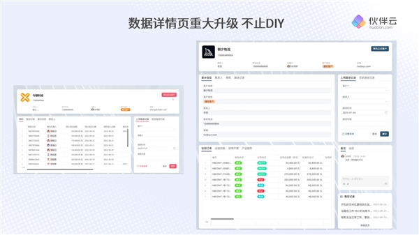 此次发布的自定义页面布局能力,不仅可以替代仪表盘,还可以自己构建数据详情页。告别难以修改的版式、颜色、字体,现在的「数据详情页」支持DIY各种你想要的页面和样式,美观和实用兼得。戴志康提到,伙伴云数据详情页的布局经历了5次革新。最初的数据详情页是简单的字段罗列,第二代支持了布局,比较短的字段可以一行放多个,提高了整个页面的数据查看效率。第三代更新可以对重点内容进行颜色标记,方便快速查看联系电话或者客户名称等;第四代做到了关联信息,比如点开客户的字段可以看到他的沟通记录、历史订单等。这里涉及到了子表和仪表盘的内容。