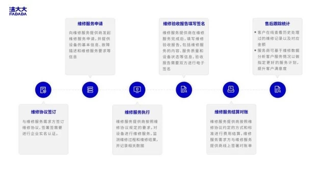 使用法大大新一代数智化签约管理平台,从维修协议签订开始,贯穿维修服务全流程,所有涉及的文件均可在线上完成,对于客户来说,能够方便快捷地在线查看产品的历史维修记录及对应金额;而对于服务商而言,也可以基于前期的维修数据,了解客户的前期服务情况,以便制定更好的服务计划,从而提升客户满意度。