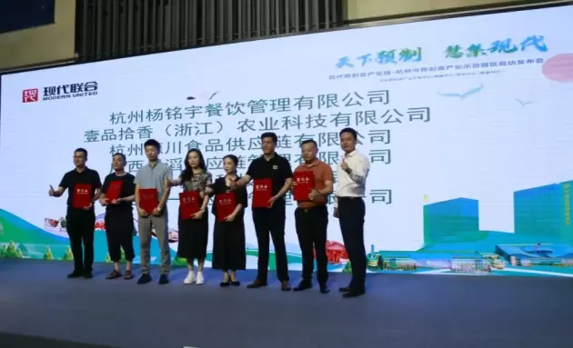 现代慧集(杭州)科技有限公司与浙江震元股份有限公司、长沙本味鲜物品牌管理有限公司、海欣食品股份有限公司、稻家(福建)预制菜运营管理有限公司、杭州译家仁健康科技有限公司、杭州杨铭宇餐饮管理有限公司、壹品拾香(浙江)农业科技有限公司、广西川滔供应链管理有限公司、杭州德川食品供应链有限公司浙江小利科技有限公司、浙江千一供应链管理有限公司等十家食品行业知名企业签订正式入园协议。