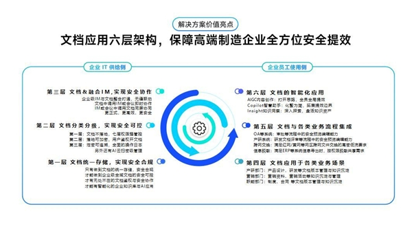 据了解,该方案最大的优势在于结合企业实际应用需求设计的“文档应用六层架构”,帮助企业实现——第一层文档统一、安全、合规存储;第二层文档分类分级管控;第三层文档与融合IM安全协作;第四层文档应用于各类业务场景;第五层文档与各类业务流程集成;第六层文档智能化应用等多个层面的诉求,全方位助力企业安全提效。
