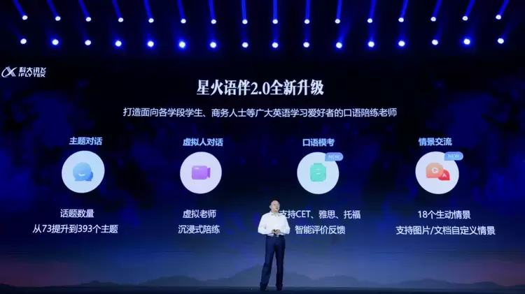在讯飞星火V2.0升级发布会现场,科大讯飞董事长刘庆峰还展示了星火语伴2.0的升级功能——在主题对话方面,话题数量呈倍数增加,从73提升到393个主题;同时支持虚拟人对话,带来虚拟老师沉浸式陪练;本次星火语伴上新口语模考功能,支持CET、雅思、托福智能评价反馈;其还主打情景交流,18个生动情景,支持图片/文档自定义情景。