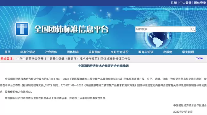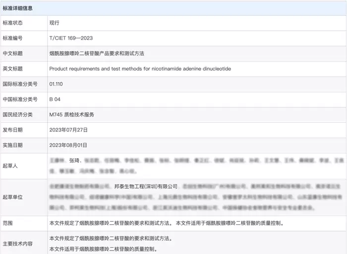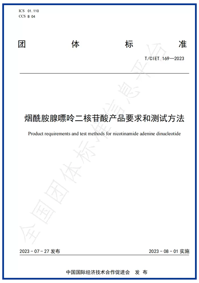就在今年8月初, 中国国际经济技术合作促进会主导的T/CIET 169—2023《烟酰胺腺嘌呤二核苷酸产品要求和测试方法》团体标准,在全国团体标准信息平台正式发布实施。